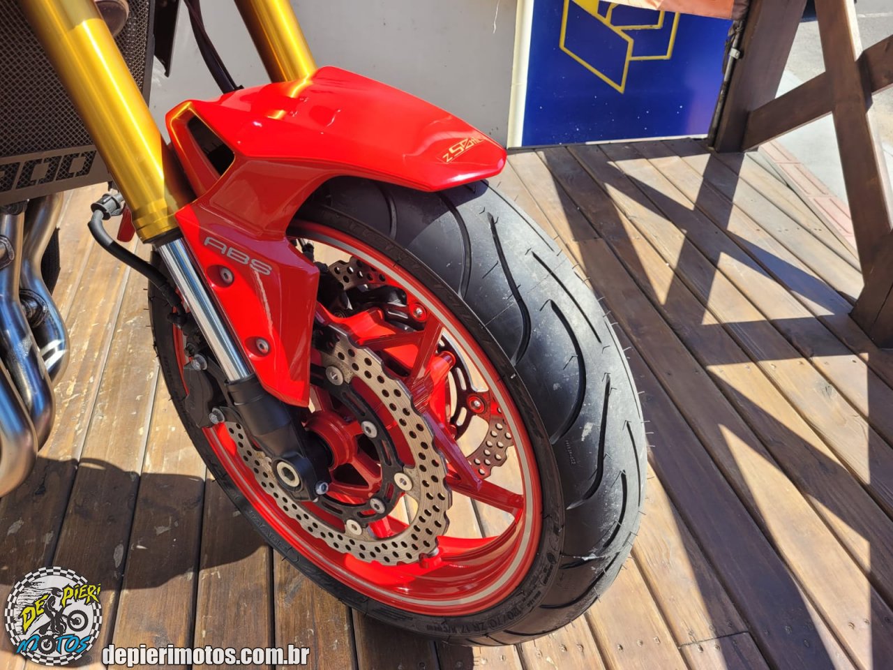 *Suspensão Dianteira Garfos invertidos (dourados nesta edição), ajustáveis